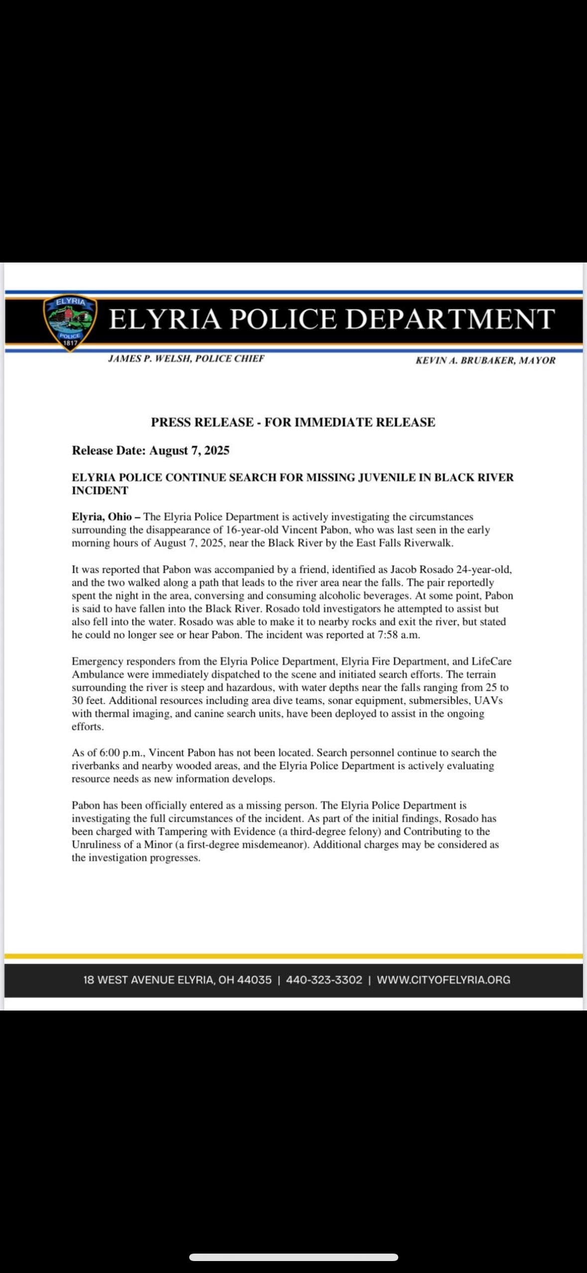 The teen is still missing, possibly last seen near the East Falls Riverwalk, behind the Elyria Police Station. Search teams are focused there, but hope is fading.