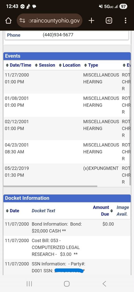 Expungement may not mean erasure in practice. Many people reasonably believe that when a case is expunged, sensitive information tied to that case is removed from public view. This incident raises serious questions about whether expungement in Lorain County actually reaches legacy docket content or whether it merely changes a case status while leaving historical entries untouched.