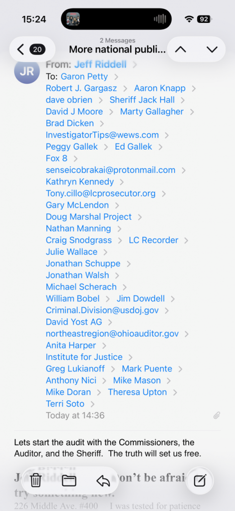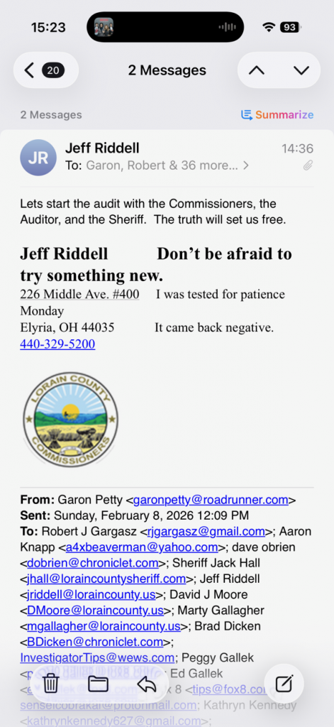 When Jeff Riddell wrote, “Let’s start the audit with the Commissioners, the Auditor, and the Sheriff. The truth will set us free,” he did not do so in a casual or ambiguous setting. This was not a social media post dashed off in the heat of an argument. It was not an unscripted remark at a public meeting that could later be dismissed as rhetorical excess or imprecise language. It was not sent from a personal email account or framed as an individual opinion detached from office. It was written on official Lorain County Commissioners letterhead and transmitted to a broad and deliberate audience that included journalists, senior state officials, the Ohio Attorney General, and the Lorain County Sheriff himself. That context is not incidental. It is determinative.