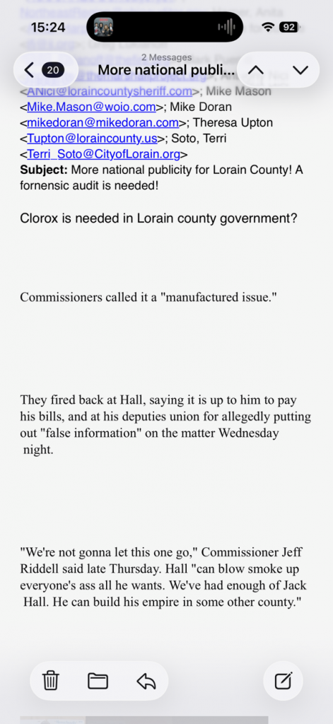 In this case, the institution being invoked is the Lorain County Board of Commissioners. Once that authority is engaged, the statement no longer belongs solely to the individual who wrote it. It attaches to the office and, by extension, to the governing body itself. That is why such communications are preserved, requested, and scrutinized in audits and investigations. They are treated as evidence of official posture, not as passing commentary.
