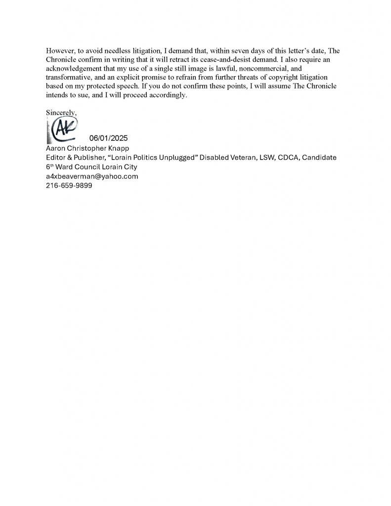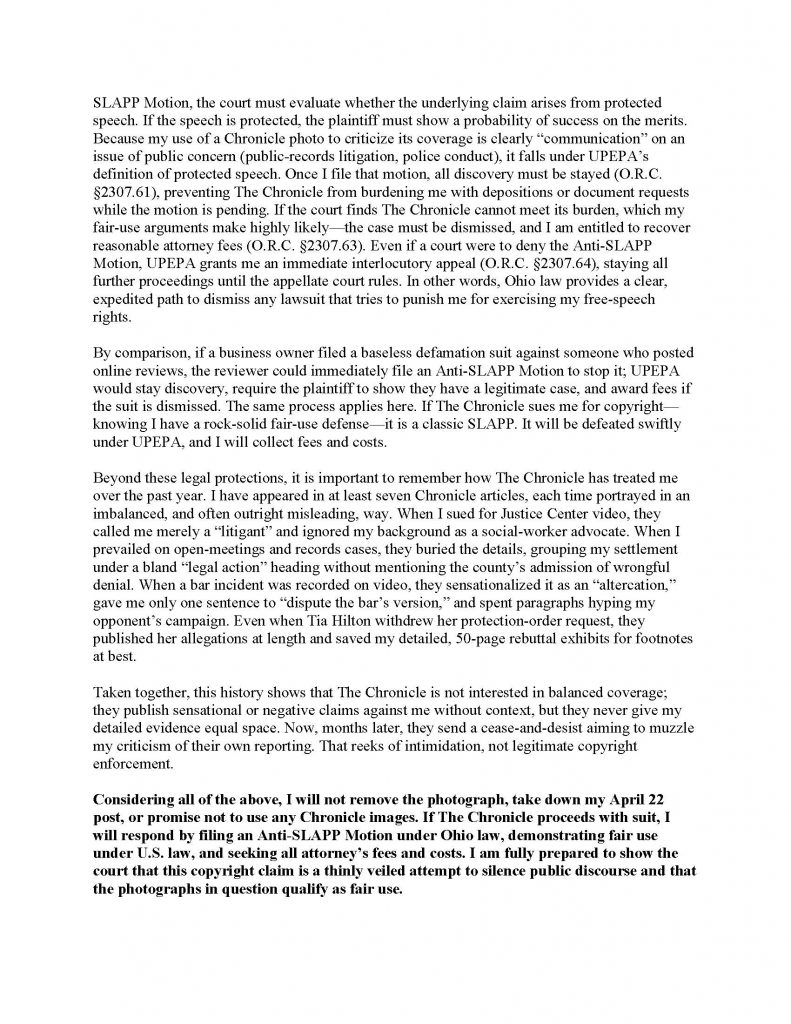 That letter backfired. The legal theory was weak, the fair use analysis overwhelmingly favored commentary, and Ohio’s then newly effective anti SLAPP statute provided a clear path to dismissal and fee shifting if the Chronicle attempted to follow through. I made that clear, in writing, and the threat quietly evaporated. The Chronicle did not sue. It did not pursue the claim further. It simply moved on, without apology and without acknowledging that it had attempted to weaponize copyright law to chill protected speech about a public official.