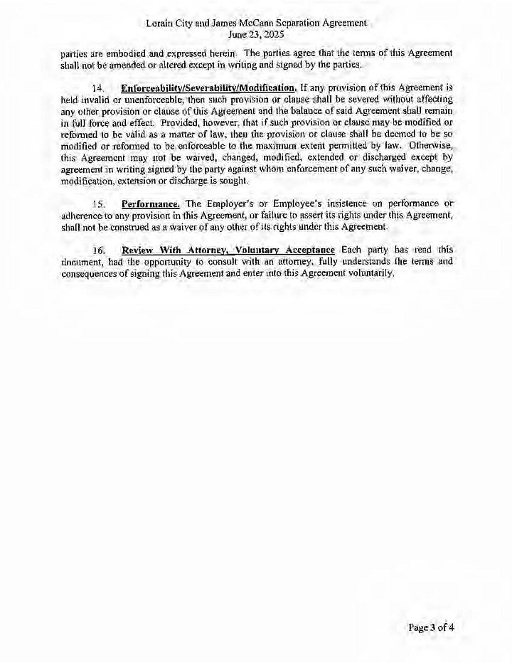 And then there’s the quiet but damning clause: McCann is prohibited from ever working for the City of Lorain again. This kind of provision is not standard in normal retirements. It’s a red flag. It suggests that, despite the public accolades, City officials recognized the severity of McCann’s conduct and quietly sought to prevent any future reinstatement or contract work. In essence, they wanted him gone—but not publicly disgraced.