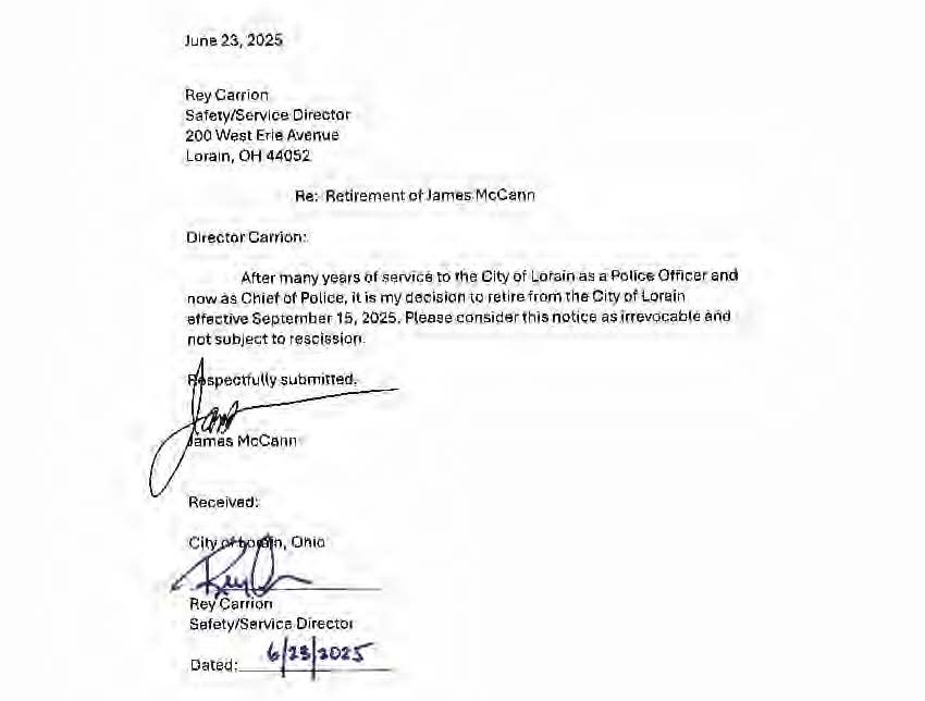The City of Lorain announces that Police Chief James P. McCann will retire effective September 15, 2025, following the conclusion of a disciplinary investigation into statements he made while on duty.