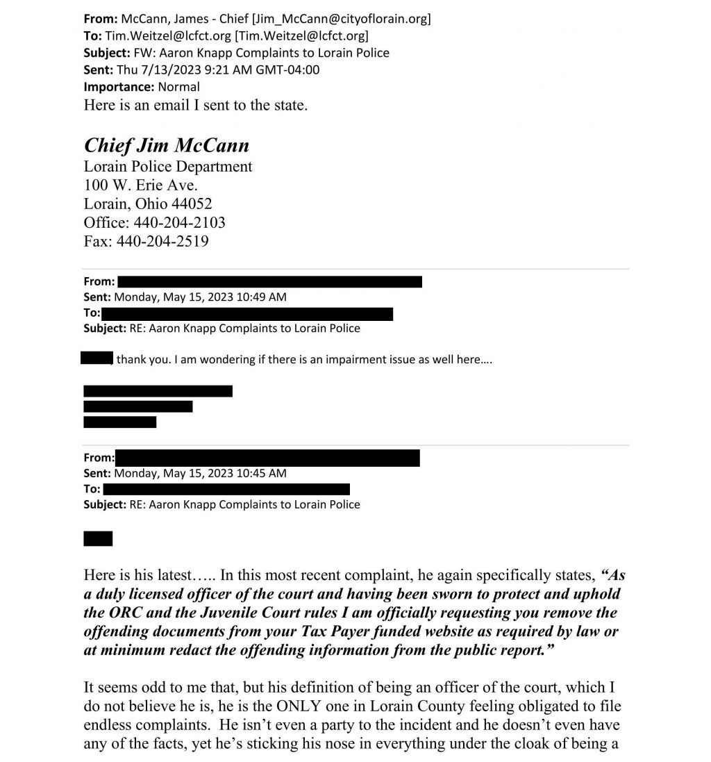 The public might assume that if you report misconduct in Lorain, your statements are reviewed, your complaints weighed by independent officials, and your rights protected by law. But what Aaron Knapp experienced was the opposite. After filing complaints about juvenile records being unlawfully posted by Chief McCann, Knapp became the target of an escalating pattern of harassment — conducted not with arrest warrants or subpoenas, but through email. Dozens of them. Direct. Unwanted. And after a clear, documented request to stop.