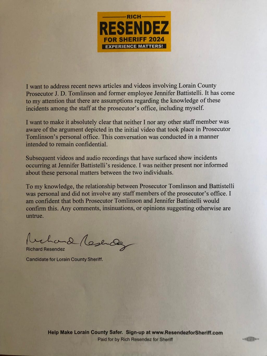 In the fall of 2024—on the eve of his run for Lorain County Sheriff—Resendez issued a public statement denying any knowledge of the internal conflict between Prosecutor JD Tomlinson and Public Outreach Coordinator Jennifer Battistelli. He claimed, verbatim, that “neither I nor any other staff member was aware of the argument depicted in the initial video.”