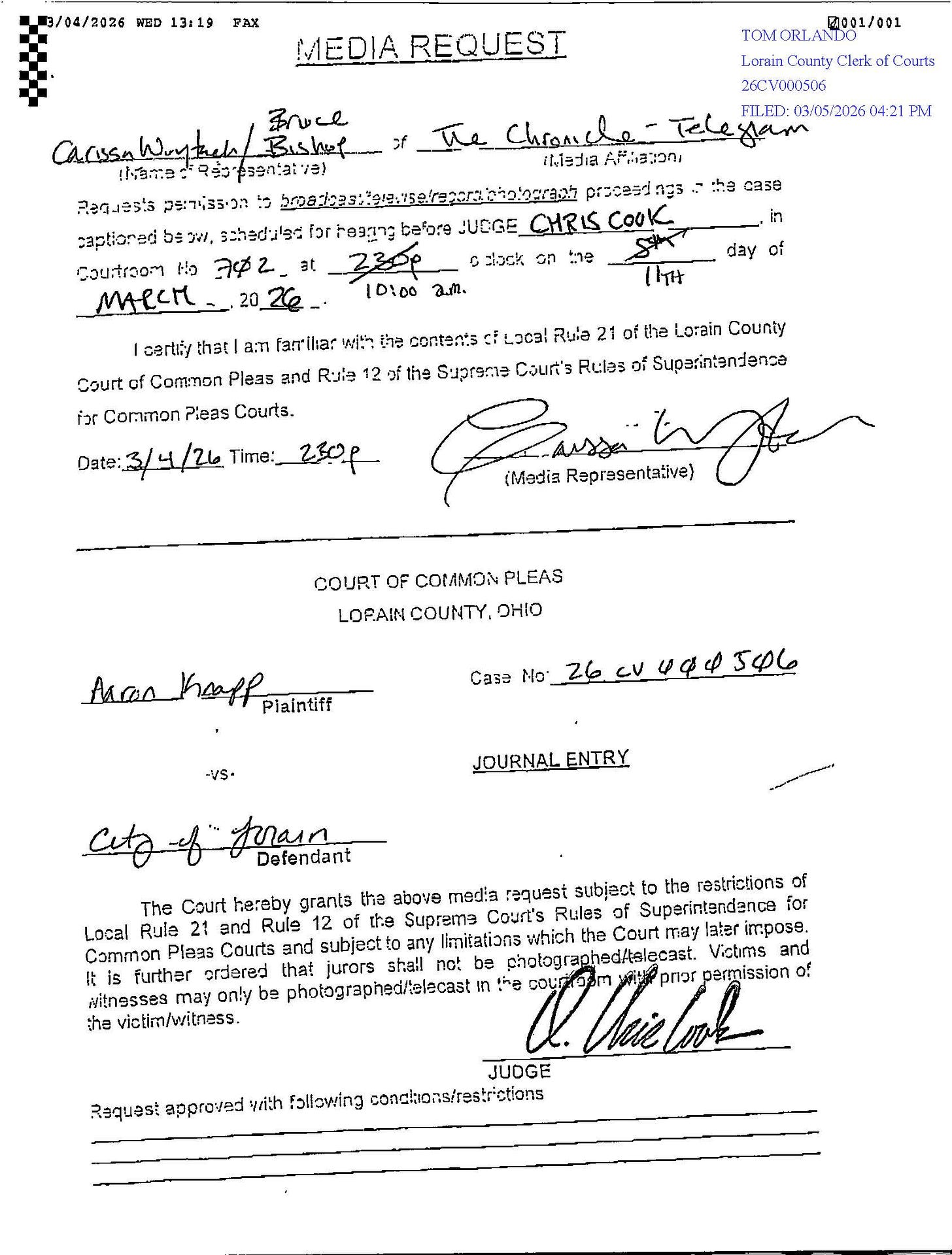 On March 5, 2026, the Lorain County Court of Common Pleas granted a formal media request submitted by the Chronicle-Telegram seeking permission to photograph and cover a hearing in the case Aaron Knapp v. City of Lorain, Case No. 26-CV-000506. The request was filed with the Clerk of Courts and approved through a signed journal entry entered on the court’s docket. The approval did not grant the newspaper unlimited access to photograph anything that occurred in the courtroom. Instead, like most courtroom media approvals, the court attached explicit restrictions governing what the media could and could not do once cameras were allowed inside the courtroom.