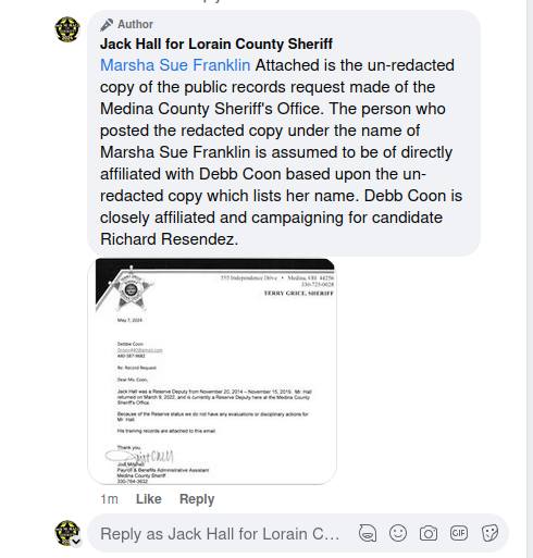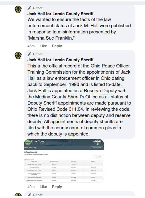 What appears on the campaign’s own public platform confirms that the issue reflected in the emails and legal opinion was not confined to private discussion or internal analysis. It was part of an active and ongoing public narrative during the election. The campaign statement reads, “Our campaign wanted to set the record straight on the facts of the law enforcement status of Jack M. Hall as a candidate for Lorain County Sheriff. This status has been repeatedly challenged and attacked by Facebook accounts with no verifiable source and an individual known as Debb Coon. Below, we have included excerpts of recent posts to our Facebook page from the account of ‘Marsha Sue Franklin.’”