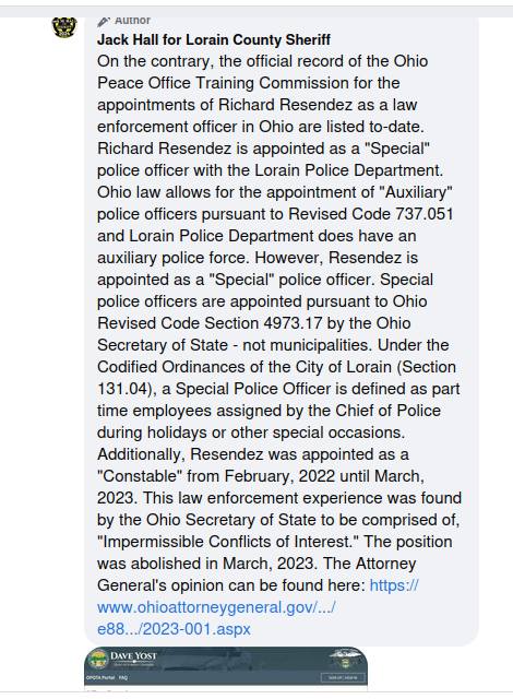 The campaign states, “Our campaign wanted to set the record straight on the facts of the law enforcement status of Jack M. Hall as a candidate for Lorain County Sheriff.” That opening line does not present the issue as unresolved. It presents the campaign as the authority on what the facts are, placing itself in the position of correcting the record rather than participating in a debate about it. The language that follows reinforces that framing by identifying criticism as coming from “Facebook accounts with no verifiable source” and specifically naming Debb Coon as part of that opposition.