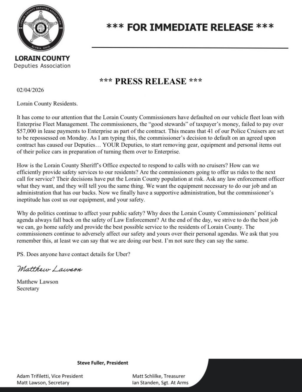 In the press release posted February 4, the association did not simply complain about funding or politics. It posed a series of blunt operational questions that cut through spin. “How is the Lorain County Sheriff’s Office expected to respond to calls with no cruisers?” asked association secretary Matthew Lawson. “How can we efficiently provide safety services to our residents? Are the commissioners going to offer us rides for the next call for service?”