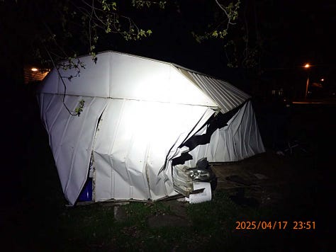 The Charger first struck a parked silver 2004 Honda Civic with enough force to shove it into a green 1996 Honda Accord parked alongside it. Then, Rivera’s vehicle continued forward, smashing into a burn barrel and slamming into a backyard shed. Tire tracks, shattered plastic, and strewn vehicle fragments told the story long before police arrived.